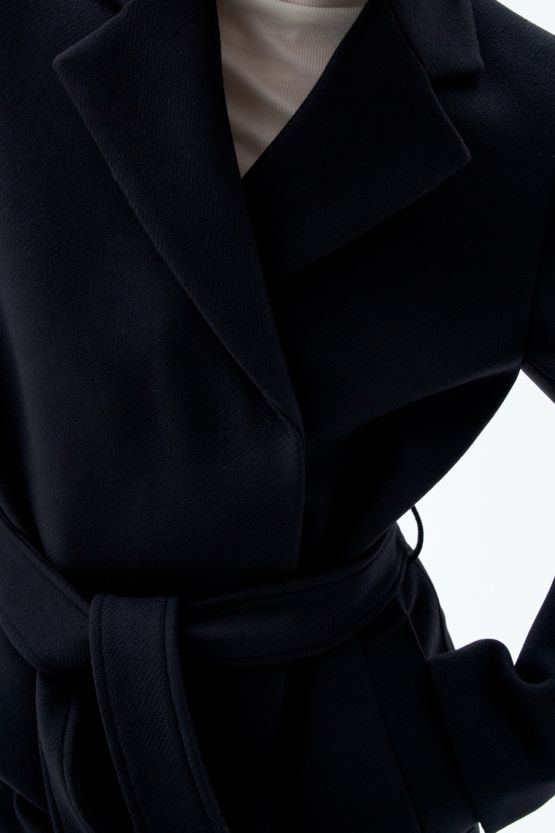 Abrigo cruzado a medida con un ajuste clásico, confeccionado con lana de traje italiano que combina fibras de lana recicladas con cachemira. Diseñado con una tapeta con botones cubiertos para una apariencia limpia y un cinturón extraíble para un estilo versátil.
