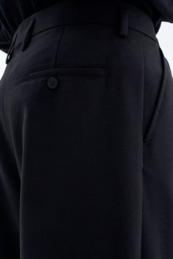 Pantalón sastre en lana merino no elástica con pernera ancha y detalle de pliegues que aporta volumen. Úselos con un jersey de cuello alto neutro o combínelos con el blazer de lana cuadrado coordinado para lograr una silueta de traje llamativa.