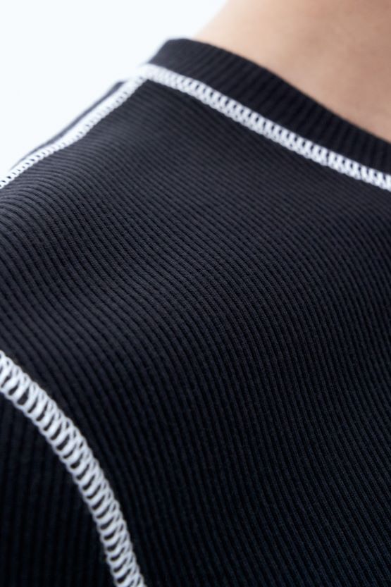 Camiseta ajustada de canalé en algodón orgánico de peso medio. detallada con costuras en contraste inspiradas en la ropa de esquí de los años 70.