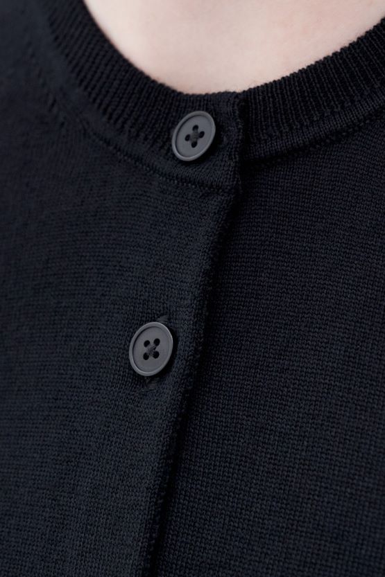 Esta pieza es parte de nuestra colección principal de prendas básicas permanentes en el guardarropa. Cárdigan ligero de lana merino con botones delanteros.